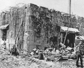Hanneken’s battle against heavy opposition from both east and south developed approximately as planned. Suddenly, in mid-afternoon, the opposition grew much heavier. Hurst’s 3/7 ran into a blockhouse, long on the Marines’ map, which had been reported destroyed by pre-landing naval gunfire. As a similar situation later met on Puller’s inland advance, the blockhouse showed little evidence of ever having been visited by heavy fire. Preparations to attack and reduce this blockhouse further delayed the 7th Marines’ advance, and the commanding general fretted further about loss of momentum.