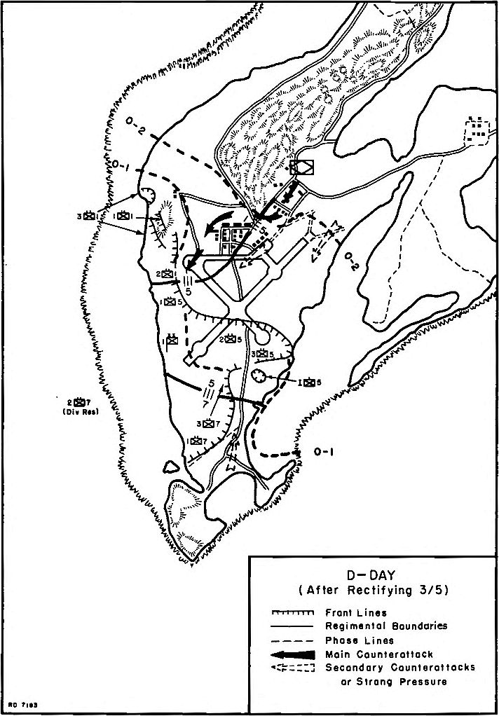 With the counterattack over and the Japanese in apparent disarray, 2/5 immediately resumed its attack, moving north along the eastern half of the airfield. The battalion advanced halfway up the length of the airfield clearing before it stopped to organize for the night. It was the maximum advance of the day, over the most favorable terrain in the division front. It provided needed space for artillery and logistic deployment to support the continuation of the attack the next day.