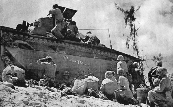 Engaged in the bitter struggle to establish the Peleliu beachhead, Marine riflemen get only momentary shelter behind an LVT, while other Marines atop the amphibian tractor fire at enemy targets. The name of the LVT was more than prophetic.