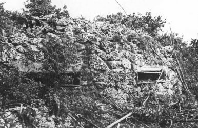 The first imponderable involved the real character of Umurbrogol, which aerial photos indicated as a rather gently rounded north-south hill, commanding the landing beaches some 2,000–4,000 yards distant. Viewed in these early photos, the elevated terrain appeared clothed in jungle scrub, which was almost entirely removed by the preparatory bombardment and then subsequent heavy artillery fire directed at it. Instead of a gently rounded hill, the Umurbrogol area was in fact a complex system of sharply uplifted coral ridges, knobs, valleys, and sinkholes. It rose above the level remainder of the island from 50 to 300 feet, and provided excellent emplacements for cave and tunnel defenses. The Japanese had made the most of what this terrain provided during their extensive period of occupation and defensive preparations.