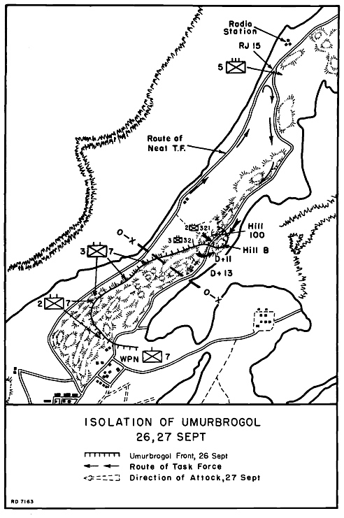 The 7th Marines’ flexibility restored by this relief, its 1st and 3d Battalions relieved the 321st units on 29 September, along the north edge of the Pocket. Then on the 30th, they pushed south, securing improved control of Boyd Ridge and its southern extension, variously called Hill 100, Pope’s Ridge, or Walt Ridge. The latter dominated the East Road, but Japanese defenders remained in caves on the west side. The 7th Marines’ partial hold on Pope Ridge gave limited control of East Road, and thereby stabilized the east side of the Pocket. But the U.S. hold over the area needed improvement.