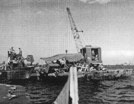 The crews of amphibian tractors board a severely damaged Japanese landing craft which was intercepted by U.S. naval patrols when it carried troops attempting to infiltrate northern Peleliu and reinforce Ngesebus Island off northwest Peleliu.