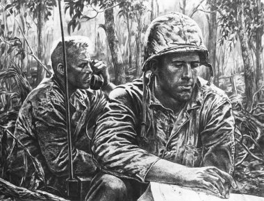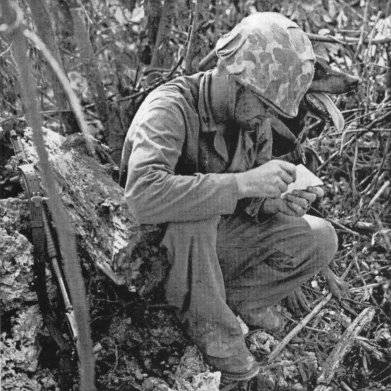 “Going In—First Wave For an hour we plowed toward the beach, the sun above us coming down through the overcast like a silver burning ball.... Over the gunwale of a craft abreast of us I saw a Marine, his face painted for the jungle, his eyes set for the beach, his mouth set for murder, his big hands quiet now in the last moments before the tough tendons drew up to kill.”