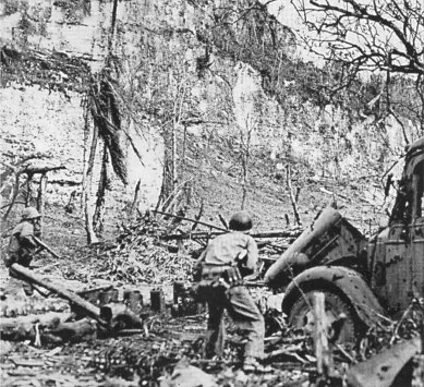 When on 20 October Major General Mueller became responsible for mopping up on Peleliu, he addressed42 the tactical problem as a siege situation, and directed his troops to proceed accordingly. Over a period of nearly six weeks, his two regiments, the 322d and 323d Infantry, plus 2/321, did just that. They used sandbags as an assault device, carrying sand up from the beaches and inching the filled sandbags forward to press ever nearer to positions from which to attack by fire the Japanese caves and dug-in strong points. They made liberal use of tanks and flamethrowers, even improving upon the vehicle-mounted flamethrower. They thrust a gasoline pipeline forward from a roadbound gasoline truck, thereby enabling them, with booster pumps, to throw napalm hundreds of feet ahead into Japanese defensive areas. Noting the effectiveness of the 75mm pack howitzer which the Marines had wrestled up to Hill 140, they sought and found other sites to which they moved pack howitzers, and from which they fired point-blank into defending caves. To support their growing need for sandbags on ridge-top “foxholes,” their engineers strung highlines to transport sand (and ammo and rations) up to such peaks and ridgetops.