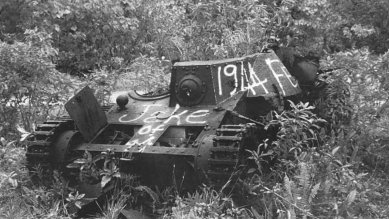 Major John H. Gustafson, in 2/5’s forward command post mid-way across the airfield, had his tank platoon close at hand. Although the enemy had not yet come into his zone of action, he launched the platoon of tanks into the melee. Accounts vary as to just who shot what, but in a very few minutes it was all over. The attacking tanks were all destroyed, and the Japanese infantry literally blown away.