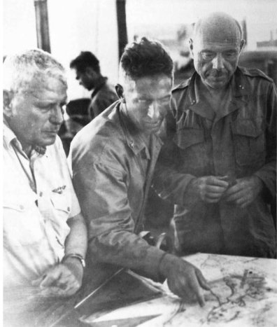 Maj Gordon D. Gayle, commander of 2d Battalion, 5th Marines, outlines in the sand proposed enemy targets in the north for LtCol Joslyn R. Bailey, Marine Aircraft Group 11. Looking on are Col Harold D. Harris, 5th Marines commander, center, and LtCol Lewis W. Walt, behind Gayle, 5th Marines executive officer.