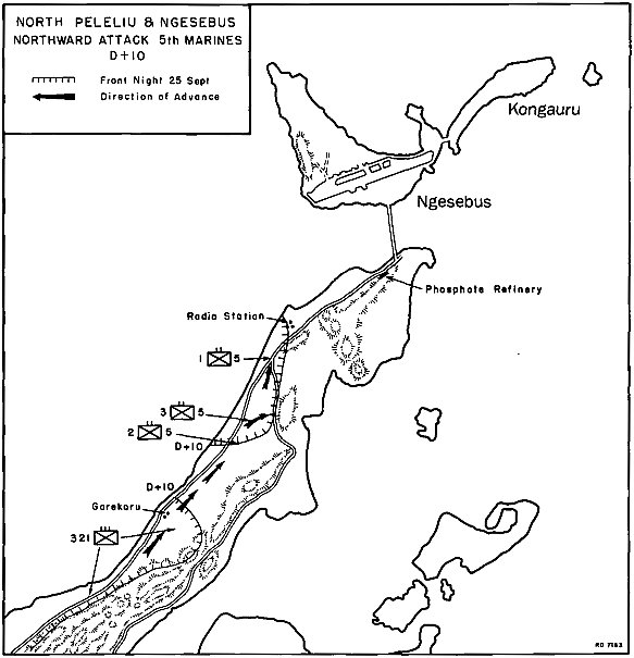 The movement of the 5th Marines across the airfield and to the western edge of the lagoon separating the airfield area from the eastern peninsula (Beach Purple), created a line of attacking Marines completely across that part of the island oriented both east and north, toward what was believed to be the major center of Japanese strength. The 7th Marines, pushing east and south, completed splitting the enemy forces. Colonel Hanneken’s troops, fully engaged, were generally concealed against observation from the enemy still north of the airfield and from the heights of Umurbrogol. There was a gap between13 the 5th’s right and the 7th’s left, but it did not appear to be in a critical sector.