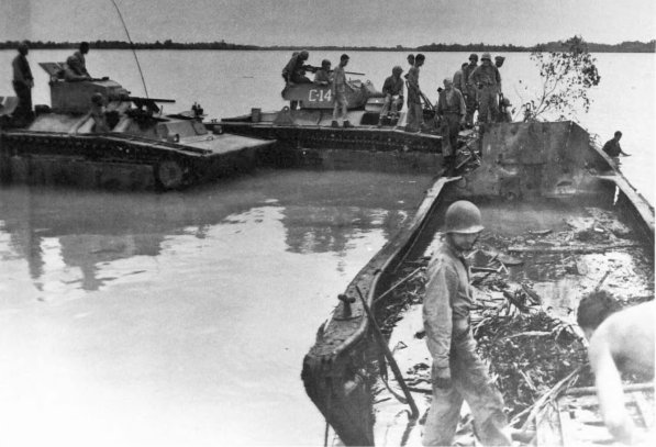 The 1st Tank Battalion’s M-48A1 Sherman medium tanks, one-third of which had been left behind at the last moment because of inadequate shipping, were landed as early as possible, using a novel technique to cross the reef. This tank landing scheme was developed in anticipation of early Japanese use of their armor capability.