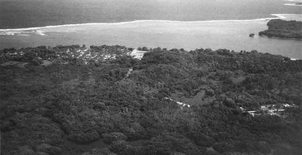 A western-looking aerial view of the northern end of Peleliu showing Peleliu village and the Amiangal Mountain. Ngesebus Island is in the upper right. Veterans of Peleliu will be amazed to note how fully the island has been recaptured by vegetation.