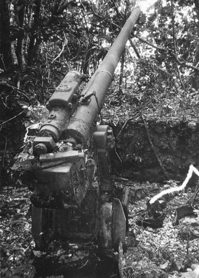Situated in a cave overlooking the airfield is this heavy caliber Japanese antiboat gun. It had a field of fire which included the invasion beaches and the airfield.