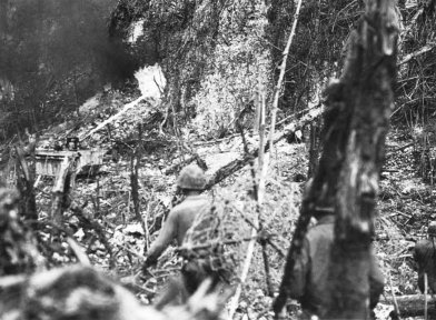 Marine riflemen accompanied by tanks push forward to the inner recesses of Horseshoe Ridge in an effort to cut off the enemy water supply and rid it of Japanese troops once and for all. The going got no easier as the Americans pushed forward.