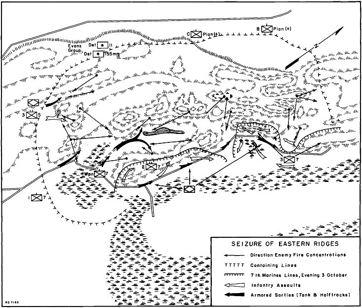 The next day, 4 October, the 7th Marines with 3/5 still attached made one more general attack—in the south, again to seize, then give up, positions on the Five Sisters; in the north, to try to advance and consolidate the positions there earlier seized.