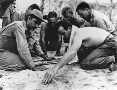 Sandbagging this piece into position posed special problems, since the only available loose sand or dirt had to be carried from the beach, or occasional debris slides. Nevertheless, the use of sandbags in forward infantry positions began to be used increasingly, and the technique was later improved and widely used when 81st Infantry Division soldiers took over further reduction of the Pocket.