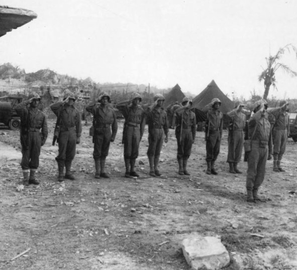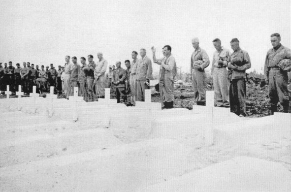 With the senior officers present, division chaplains dedicate a new cemetery created at Orange Beach 2. The 1st Division commander, MajGen Rupertus, with a cane, is near the center and to his right is Col Puller (1st Marines). Grouped on the extreme right are: BGen Smith, assistant division commander; Col Harrison (11th Marines), and Col Harris (5th Marines). Not present at this time was the 7th Marines’ commander, Col Hanneken, whose regiment was still engaged with the enemy.