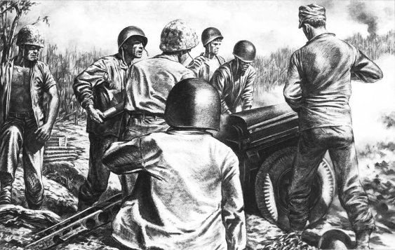 The last position seized, Hill 140, just north of the Five Brothers, afforded a firing site to which a 75mm pack howitzer was wrestled in disassembled mode, reassembled, sandbagged, and then effectively fired from its then-commanding position. It could fire into the mouth of a very large cave at the base of the next ridge, from which serious fire had been received for days.