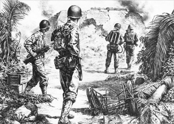 D-Day and H-Hour brought heavier than expected casualties. One of the company’s platoons was pinned down all day in the fighting at the beach. The survivors of the rest of the company wheeled left, as planned, onto the flanking point. Moving grimly ahead, they pressed assaults upon the many defensive emplacements. Embrasures in the pillboxes and casements were blanketed with small-fire arms and smoke, then attacked with demolitions5 and rifle grenades. A climax came at the principal casement, from which the largest and most effective artillery fire had been hitting LVTs on the flanks of following landing waves. A rifle grenade hit the gun muzzle itself, and ricocheted into the casement, setting off explosions and flames. Japanese defenders ran out the rear of the blockhouse, their clothing on fire and ammunition exploding in their belts. That flight had been anticipated, and some of Hunt’s Marines were in position to cut them down.
