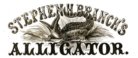 STEPHEN H. BRANCH’S “ALLIGATOR” CAN BE obtained at all hours, (day or night,) at wholesale and retail, at No. 128 Nassau Street, Near Beekman Street, and opposite Ross & Tousey’s News Depot, New York.