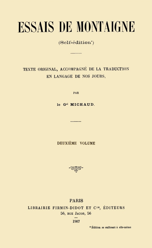 * Ce volume, indépendant des autres, est susceptible par sa contexture d'être aisément utilisé avec n'importe quelle édition des Essais ancienne ou moderne, moyennant un simple tableau de concordance de pagination facile à établir soi-même.
