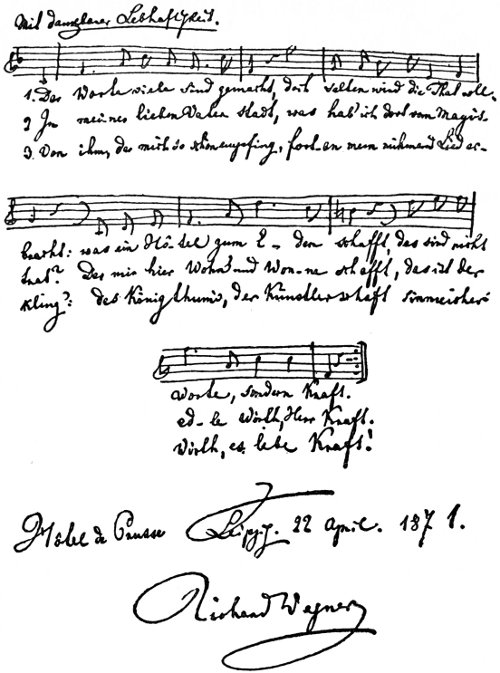 In a letter dated June 25, 1870, Wagner wrote of his wife Cosima, “She has defied every disapprobation and taken upon herself every condemnation. She has borne to me a wonderfully beautiful boy, whom I call boldly Siegfried; he is now growing, together with my work [he was working then on the opera Siegfried; hence the name]; he gives me a new long life, which at last has attained a meaning. Thus we get along without the world, from which we have wholly withdrawn.”