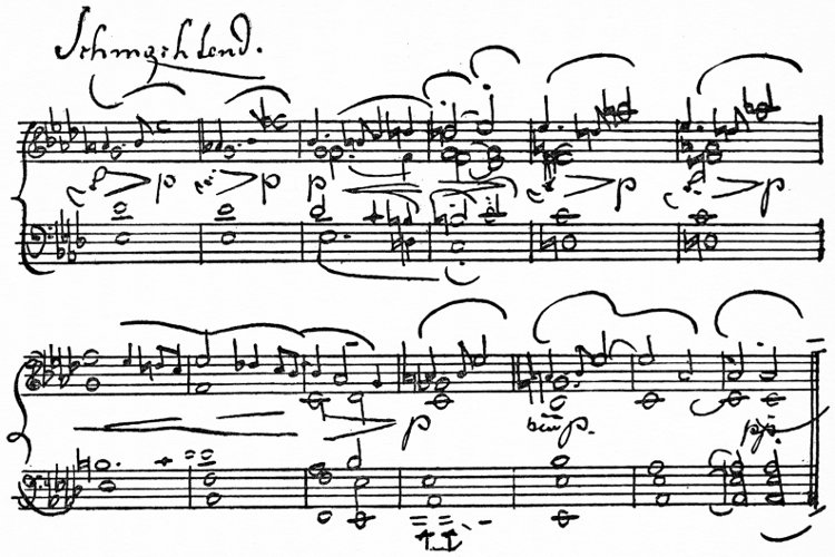 “Like the hero’s career in the opera, it begins, as it were, in the clouds, then gradually descends farther and farther until it embraces all the lower tones of the orchestra, and then returns to the clouds again. Its single theme is developed in free polyphony by various successive groups of instruments, each of which groups proceeds with free counter-thematic work as the next group enters with the theme. First we have the violins piano in their higher registers; then come the flutes, oboes, and clarinets; then the violas, ’cellos, horns, bassoons, and double-basses; lastly the trumpets, trombones, and the tuba fortissimo; then comes the decrescendo, ending pianissimo in the high violins and flutes.”