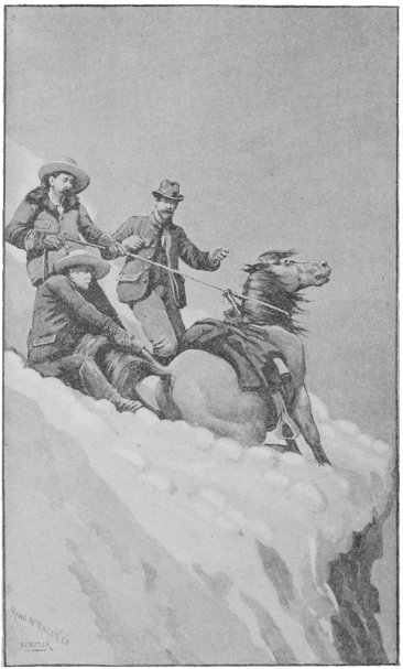 Caught in several blizzards on the mountains, and following unknown trails, many perilous adventures were met with on the expedition, but fortunately no life was lost, though one adventure well nigh proved fatal to Major Mildmay of the Grenadier Guards, giving an opportunity to Colonel Cody to show his nerve in sudden danger and his skill with a lasso as well, for, but for his quick act, horse and rider would have run over a precipice a couple of thousand feet down to the valley below.