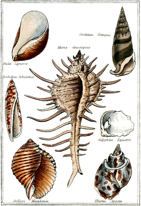 Pyramidèlla dolabrata. Scalària commùnis. Delphinula lacinìata. Solarium perspectivum. Trochus tuber. Monodonta labio. Turbo pica. Phasianella bulimoìdes. Cerithium vertagus. Pyrula ficus. Ranella crumèna. Murex haustèllum. Triton lotorium. Pterocera lambis. Strombus lineàtus. Cassis arèola. Ricinula horrida. Purpura patula. Monoceros imbricatum. Concholepas Peruvianus. Harpa ventricosa. Dolium maculàtum. Eburna spiràta. Terebra maculàta. Columbella mercatòria. Mitra episcopàlis. Voluta musica. Volraria monìlis. Ovula oviformis. Cypræa cribària. Terebellum subulàtum. Oliva utriculus. Conus virgo. Nautilus hians. Spirula Peronii. |