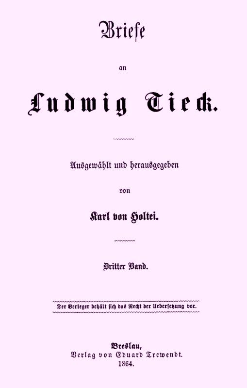 Kaum darf ich hoffen, daß Ew. Wohlgeb. sich meiner noch erinnern werden, wiewohl es kaum 18 Monate sind, daß ich Ihrer Güte das Glück verdanke, an zwey der interessantesten Abenden meiner damaligen Reise Ihren Vorlesungen in Dresden beywohnen zu können. Doch Sie breiten mit wahrhaft dichterischer Munifizenz diese schöne Gottesgabe über so viele Reisende aus, daß sich der Einzelne kaum schmeicheln darf mit der Hoffnung, in Ihrem Andenken eine kleine Spur zurückzulassen. Und doch wag’ ich es, dem Ueberbringer diese Zeilen mitzugeben? — Eben dieß Wohlwollen nicht allein, das ich aus eigener Erfahrung kennen gelernt, sondern auch die Ueberzeugung, die ich gewonnen habe, daß Ueberbringer, Herr von Wekherlin, Sohn des verstorbenen Finanz-Ministers in Stuttgard, ein gebildeter Mann, der im Auftrag des Staats eine wissenschaftliche Reise unternimmt, ein eben so großer und inniger Verehrer von Ihnen ist, wie ich selbst, haben mich dazu[S. 362] ermuthigt. — Herr von Wekherlin hat keinen weitern und innigern Wunsch für seinen Aufenthalt in Dresden, als des Glückes Ihrer Bekanntschaft theilhaftig zu werden. — Sollte Sie dieß nicht diesem Wunsch geneigt machen? — O gewiß! Der Dichter des Oktavians, des Fortunats, der Genofeva — deren Lektüre ich jetzt eben wieder einen so herrlichen Genuß verdanke — einen Genuß, den ich dem Dichter selbst als beßten Lohn für diese reiche Spenden seiner Muse gönnte — ist nicht bloß in seinen Werken so überschwenglich theilhaftig für seine Mitwelt! — Diese Werke liegen eben um mich her. — Besonders merkwürdig ist mir Genofeva. An sie knüpfen sich die lebendigsten und tiefsten Erinnerungen aus meiner Jugend, als ich noch in Jena studirte. — Wie wir da, einige 20 Bursche, unter Vorsitz eines gewissen Burkhardt, der bey Professor Mereau wohnte — dieses treffliche Gedicht — das wohl damals gerade erschienen war — in den Mitternachtsstunden zusammen andächtig lasen, welche Freuden, welcher Jubel! — An die Rolle des Golo mit seinen wiederkehrenden Erinnerungen an das stille — dann ernste — Thal schloß ich mich innig an; ich betrachtete sie als die schönste Aufgabe für den jugendlichen Schauspieler. — Wie viel Ehrfurcht hegten wir für die nicht unempfindliche und doch heilige Genofeva! — Und wie trat alles dieß mahnend auf mich zu, als ich auf jener Reise in Weimar das Skandal erlebte, die Raupachische aufführen zu sehn — eine preußisch protestantisch leichtfertige — der zu Liebe und zum Triumpf des Unsinns doch auch Wunder über Wunder geschehn, die selbst Golo — wiewohl er gleich in voller Leidenschaft auftritt — von der Begleitung Siegfrieds abhalten &c. Doch ich fürchte ins Schwatzen zu kommen, worein der Glückliche so gern fällt und der Genuß, den mir Ihre Dichtungen jetzt wieder verschafft haben, hat mich ganz glücklich gemacht. — Empfangen Sie demnach zugleich meinen[S. 363] innigsten Dank dafür. — Es ist der reinste für die schönsten Freuden dieses sublunarischen curiosen Lebens.