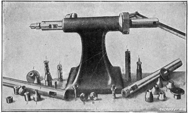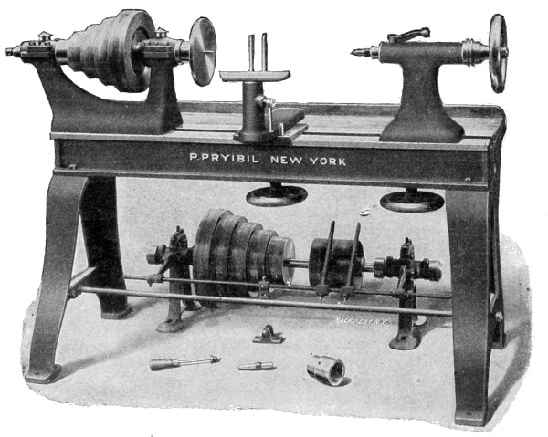 The principal tool used in the operation of spinning is the spinning lathe, shown in Fig. 1. While in many respects this machine is similar to any other lathe, it is built without back-gears, carriage or lead-screw, is very rigid in construction, and, on the whole, very much resembles a speed lathe. Like other lathes, the spinning lathe is fitted with a cone pulley (preferably of wood, because of its lightness and gripping qualities), allowing the use of four or five different speeds. Speed is an important factor in spinning. Arbitrary rules for spinning speeds cannot be given, as the thicker the stock the slower must be the speed; thus while ¹/₃₂-inch iron can be readily spun at 600 revolutions, ¹/₁₆-inch iron would necessitate reducing the speed to 400 revolutions per minute. Zinc spins best at from 1,000 to 1,400 revolutions; copper works well at 800 to 1,000; brass and aluminum require practically the same speed, from 800 to 1,200; while the comparatively slow speed of 300 to 600 revolutions is effective on iron and soft steel. Brittania and silver spin best at speeds from 800 to 1,000 revolutions.