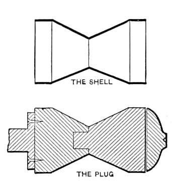 Another kind of sectional chuck, known to the trade as a “plug” (shown in Fig. 5) is used extensively in some shops in cases where the shell must have projections or shoulders at both ends, and no bottom to the shell is required. In making the plug, which is always in two parts, the first half is turned to take the shell from one end to the center of the smallest diameter. Into the end of this part is bored a hole to which is fitted the end of the second part, which is afterwards turned to fit the shell. Over this two-part plug the shell is spun; then the bottom of the shell is cut out and the first half of the plug removed, thus allowing the shell to be withdrawn. The first part is then replaced and the plug is ready for use again. Fig. 4 shows a method of spinning difficult shells that ordinarily would require a sectional chuck. The shell shown at the left of Fig. 4 is first spun as far as the bulged part on an ordinary form that ends at this point. Then after annealing, it is replaced on the form and while another operator holds the wooden arm, supported with a pin in the T-rest, the spinner forms the metal around the bulge-shaped end of the arm. The arm, being stationary on the inside of the shell, acts as a continuation of the spinning form, and by this method as good a shell is obtained as could be spun with a sectional chuck.