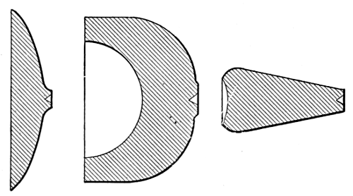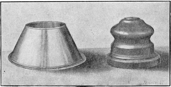 In starting to spin a difficult shell it sometimes happens that the[9] necessarily small follower will not hold the blank. To prevent this slipping, the face of the follower is covered with emery cloth. Often, however, on rough work, the spinner will not stop to face the follower, but will make a large shallow dent at the center of the blank; the extra pressure required to force the metal against the form will usually overcome the slipping tendency.
