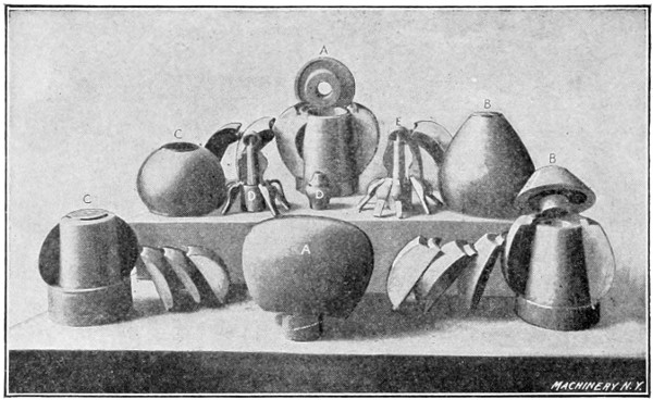 In Fig. 22 two finished brass shells are shown to the right, and also the number of operations required to change the form of the metal. The upper shell is 6 inches long and 3½ inches in diameter at the large end, while the lower one is 7¼ inches long by 3¾ inches in diameter. It was necessary to anneal these shells between each operation, the upper shell being annealed four times and the lower one three times. These pieces were made in quantities sufficient to warrant the making of chucks for each operation, which enabled them to be spun with less skill than would be required if a finishing chuck only were made. When a single finishing chuck is used, the various operations in spinning a shell of this kind would be left to the judgment of the spinner, who would decide the limit of the stretch of metal between the operations before annealing.