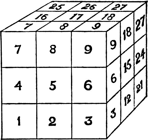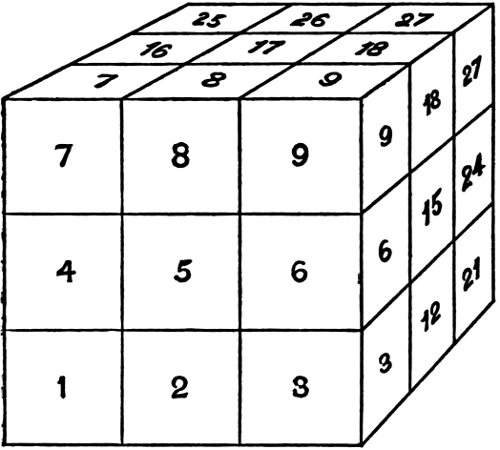 We have now a straight line two inches long. On this a square has been constructed containing four 10 square inches. If on the same line a cube be constructed, the number of cubic inches in the figure so made is 8, i.e., 2 × 2 × 2 or 2³. Here, corresponding to the numbers 2, 2², 2³, we have a series of figures. Each figure contains more units than the last, and in each the unit is of a different kind. In the first figure a straight line is the unit, viz., one linear inch; it is said to be of one dimension. In the second a square is the unit, viz., one square inch. The square is a figure of two dimensions. In the third case a cube is the unit, and the cube is of three dimensions. The straight line is said to be of one dimension because it can be measured only in one way. Its length can be taken, but it has no breadth or thickness. The square is said to be of two dimensions because it has both length and breadth. The cube is said to have three dimensions, because it can be measured in three ways.