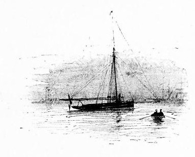 I went down into the cabin, lighted up by a couple of candles hanging and balanced like compasses, at the foot of the sofas which at night were used as beds, I donned the leathern sailor's jacket, put on a warm cap, and returned on deck. Already the hawsers had been cast off, and the two men hauling in the cable, had brought the anchor apeak. Then they hoisted the big sail, which went up slowly to the monotonous groan of blocks and rigging. It rose wide and wan in the darkness of the night, quivering in the breath of the wind, hiding from us both sky and stars.