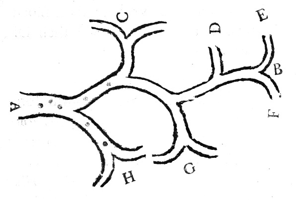 Let the Canal A be an Artery of a middle Size, sending out the Branches C, D, E, F, G, H; Let the Dotts represent the increased Moleculæ of the Blood, it is evident that these must be stopt some where or other in the Ramifications of the Vessels C, D, E, F, G, H, whenever the Diameters of the Moleculæ exceed those of the containing Vessels.