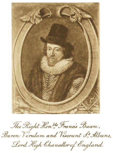 Concerning the illustrations, I may be allowed to say a few explanatory words. The two photogravure reproductions are taken respectively from a miniature by Peterviii Oliver, belonging to the Duke of Buccleuch, and from a very rare print of Bacon. The print from Vansomer’s painting, the picture of Bacon’s monument, and the portraits of Sir Nicholas Bacon, Sir Nathaniel Bacon, the Earl of Essex and Queen Elizabeth, and the views of Stratford-on-Avon and Gorhambury will, I trust, be found of general interest. The facsimile pages from “Sylva Sylvarum” and the “Novum Organum,” with their allegorical devises and fine workmanship, illustrate the contrast between the manner in which the works of Bacon and those of Shakespeare were given to the world. The portraits of Shakespeare contained here are well known to students. The reproduction of the bust will be familiar to all visitors to Stratford, the “Droeshout” Engraving is the picture which forms the frontispiece to the First Folio, and the original of the Chandos portrait is now in the National Portrait Gallery.
