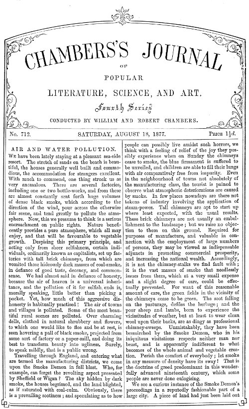 We have been lately staying at a pleasant sea-side resort. The stretch of sands on the beach is beautiful, the houses generally well built and commodious, the accommodation for strangers excellent. With much to commend, one thing struck us as very anomalous. There are several factories, including one or two bottle-works, and from these are almost constantly sent forth huge volumes of dense black smoke, which according to the direction of the wind, pour across the otherwise fair scene, and tend greatly to pollute the atmosphere. Now, this we presume to think is a serious encroachment on public rights. Nature beneficently provides a pure atmosphere, which all may enjoy, and that will be favourable to vegetable growth. Despising this primary principle, and acting only from sheer selfishness, certain individuals, ordinarily known as capitalists, set up factories with tall brick chimneys, from which are vomited those hideously dark masses of coal-smoke, in defiance of good taste, decency, and common-sense. We had almost said in defiance of honesty, because the air of heaven is a universal inheritance, and the pollution of it for selfish ends is, morally speaking, little better than picking a pocket. Yet, how much of this aggressive dishonesty is habitually practised! The air of towns and villages is polluted. Some of the most beautiful rural scenes are polluted. Over charming dells, clothed in natural shrubbery and flowers, to which one would like to flee and be at rest, is seen hovering a pall of black smoke, projected from some sort of factory or a paper-mill, and doing its best to transform beauty into ugliness. Surely, to speak mildly, that is a public wrong.