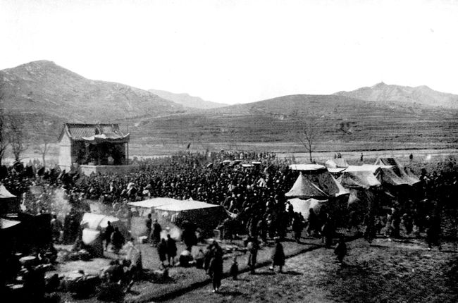 The Ch'êng-tu plain, with its marvellous system of irrigation and its three or four crops a year, is the richest and most populous district in the whole of the Chinese Empire. This extraordinarily productive plain is about 90 miles long by 70 wide, and supports a population estimated at no less than 4,000,000, of whom about 350,000 reside within the capital itself. It is studded with many prosperous towns and villages, and is cultivated to its utmost extent. Among the crops are rice, wheat, tea, tobacco, maize, the opium-poppy, which was not yet in bloom, and the yellow rape that turned hundreds of acres of land into seas of bright gold. The plain is connected by a navigable waterway (the Min) with the Yangtse, and it is in the heart of the richest province in China. The city of Ch'êng-tu has been identified with Marco Polo's Sindafu. "This city," wrote Marco in the thirteenth century, "was in former times a rich and noble one, and the kings who reigned there were very great and wealthy." Of the Min river—which had not then been subdivided to the same extent as at present into artificial channels for irrigation—he says: "The multitude of vessels that navigate this river is so39 vast that no one who should read or hear the tale would believe it. The quantities of merchandise also which merchants carry up and down this river are past all belief."9