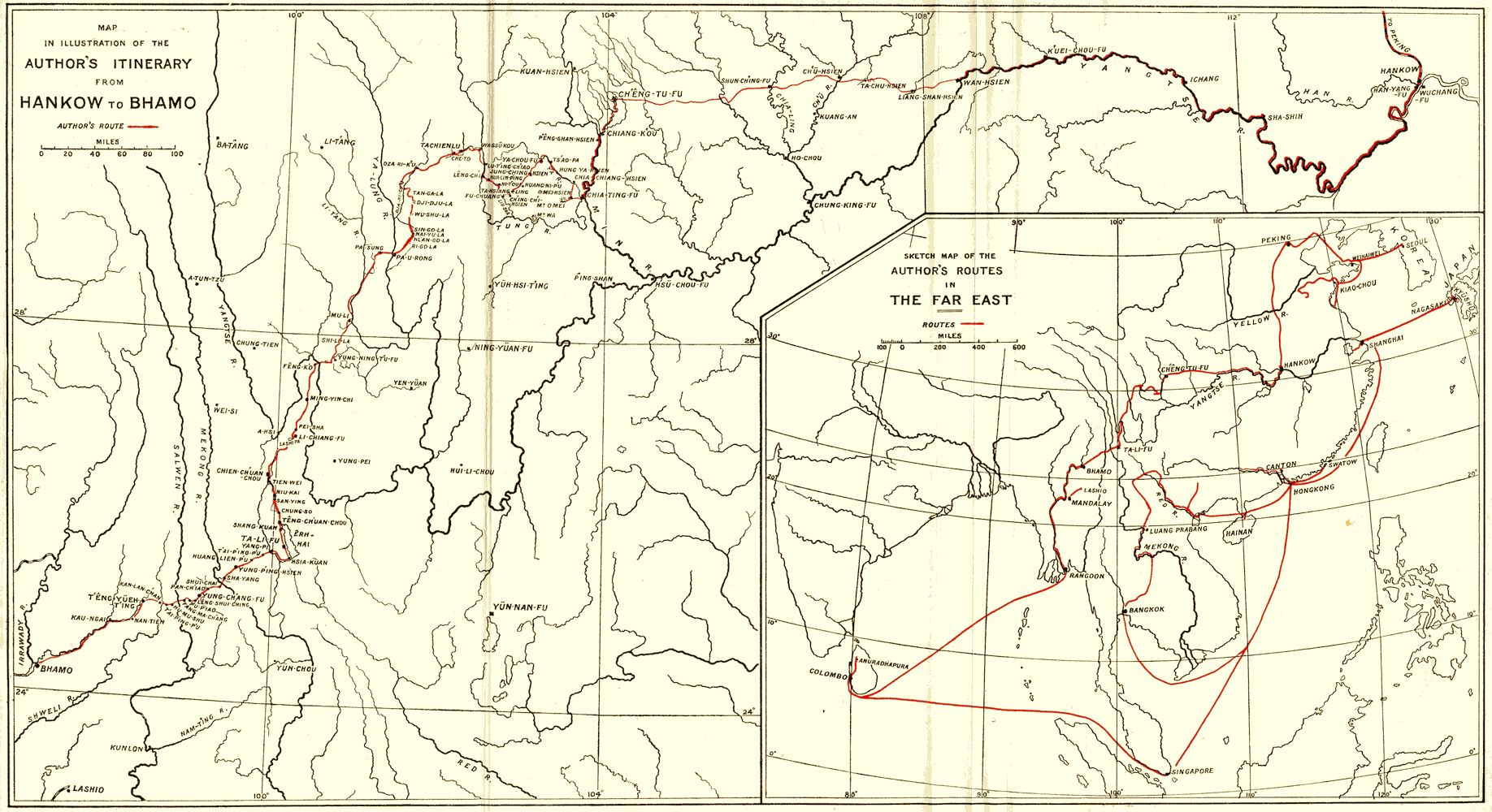 The journey described in the following pages was of a more ambitious character than those just mentioned, and occupied the greater part of a year. My intention was to ascend the Yangtse to the province of Ssuch'uan, and thence to make my way across that province to those principalities of eastern Tibet that now own allegiance to the emperor of China. I intended if possible to make my way southward through those states, and so enter the province of Yunnan; whence, as I knew from the narratives of former travellers, I should have no difficulty in making my way into Upper Burma. The details of my route I left to be determined by circumstances. Though I was occasionally subjected to minor disappointments and delays, the assistance of the various local officials and the friendly spirit shown by the people among whom I travelled enabled me to carry out my plans with success.