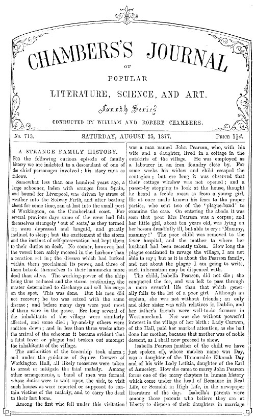 Among the first who fell under this visitation was a man named John Pearson, who, with his wife and a daughter, lived in a cottage in the outskirts of the village. He was employed as a labourer in an iron foundry close by. For some weeks his widow and child escaped the contagion; but ere long it was observed that their cottage window was not opened; and a passer-by stopping to look at the house, thought he heard a feeble moan as from a young girl. He at once made known his fears to the proper parties, who sent two of the 'plague-band' to examine the case. On entering the abode it was seen that poor Mrs Pearson was a corpse; and her little girl, about ten years old, was lying on her bosom dreadfully ill, but able to cry: 'Mammy, mammy!' The poor child was removed to the fever hospital, and the mother to where her husband had been recently taken. How long the plague continued to ravage the village, I am not able to say; but as it is about the Pearson family, and not about the plague I am going to write, such information may be dispensed with.