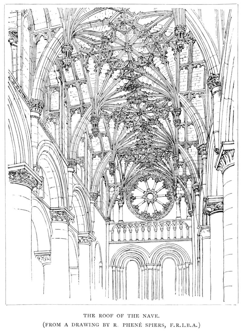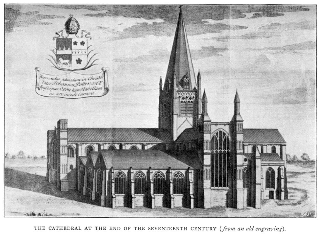 The "Cathedral Church of Christ in Oxford" has had a somewhat unfortunate history. Built for the small monastery of St. Frideswide, with no thought of any ampler destination, it was in the sixteenth century raised to the rank of a cathedral, just after it had been reduced in size by the destruction of the bays of the nave, and sunk out of sight among a mass of college buildings. Nor was this all the indignity it suffered; for it had also to do duty as the chapel of the new academic foundation which Wolsey established, and very soon the cathedral was forgotten in the college chapel. So neglected was it that Britton wrote at the beginning of the present century—"It is very common for visitors, and even those of rather refined and critical minds, to leave Oxford without examining the building now under notice." A century earlier Browne Willis had been content to make the astounding observation: "'Tis truly no elegant structure."