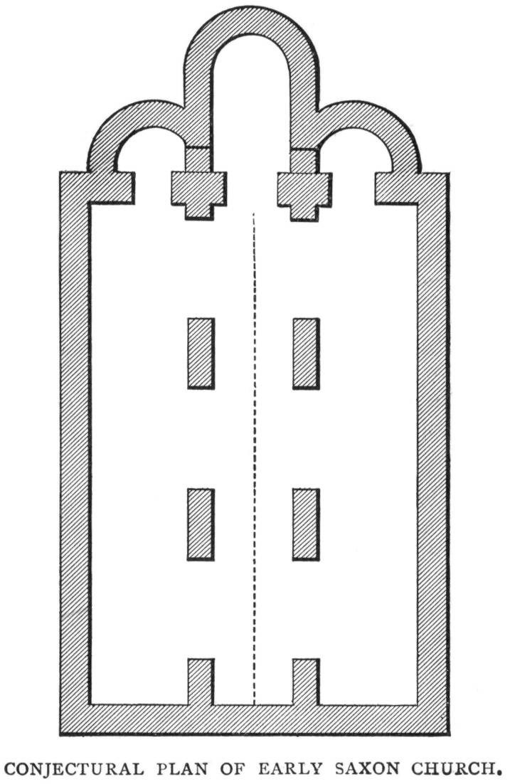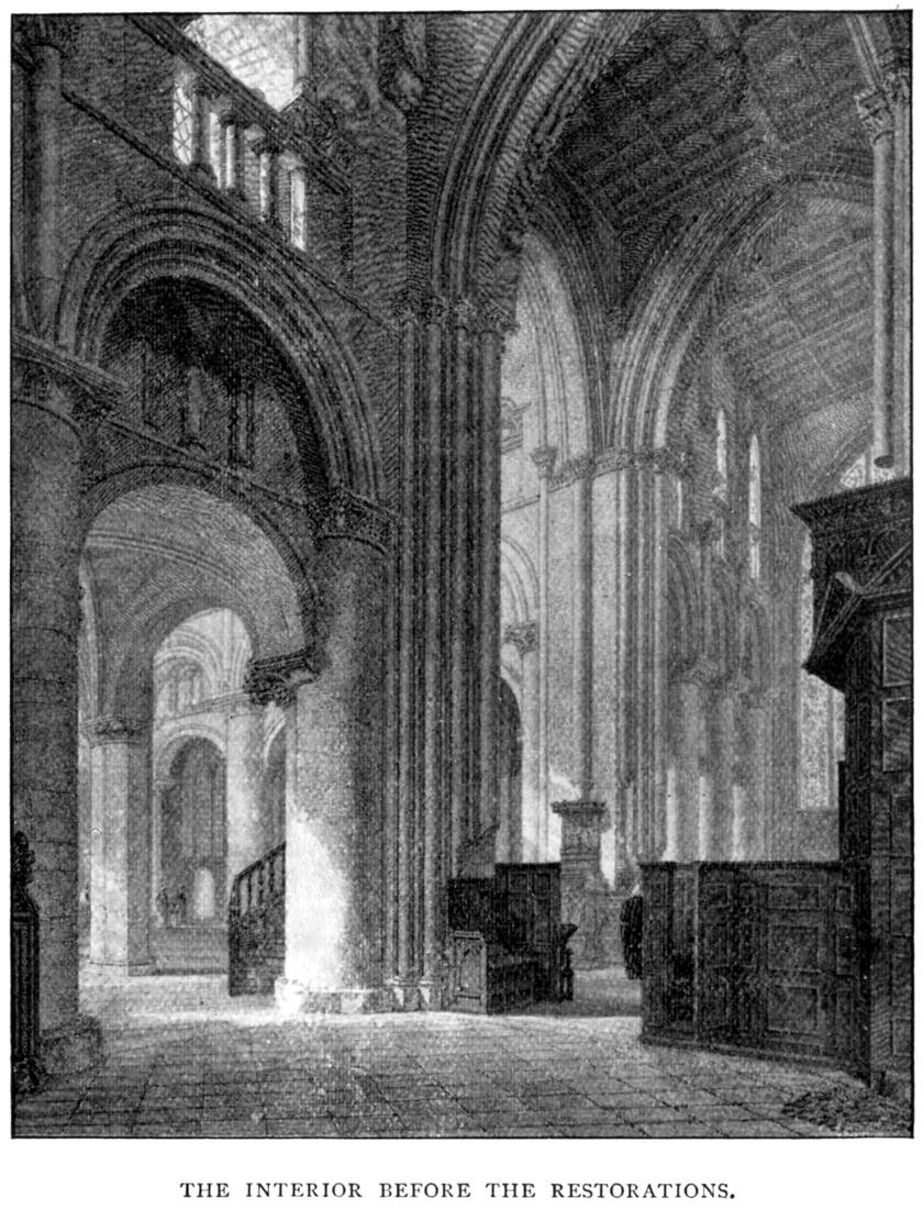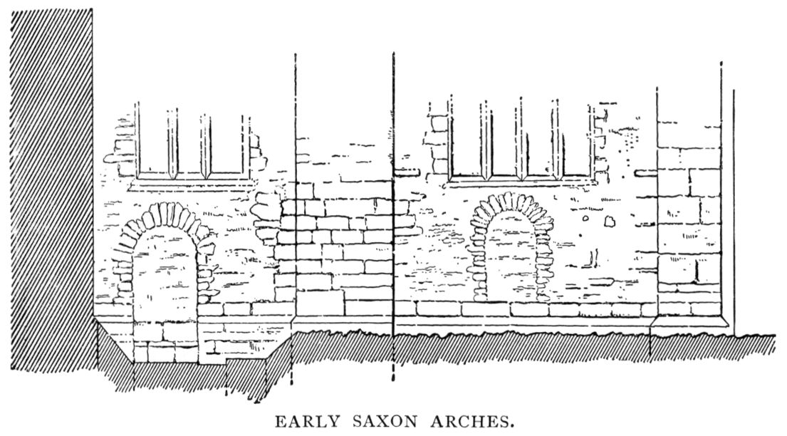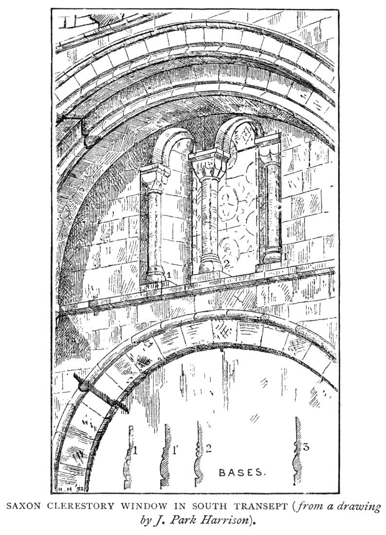 This closes the first era in the history of the church: the old ecclesiola of Didan and his daughter was gutted by the fire, and its roofs and furniture destroyed. Indeed, until lately it was held that the whole building was of wood, and perished therefore with the tower and roof, no vestige of it remaining for later times. But the recent investigations of Mr. J. Park Harrison, an archaeologist of remarkable devotion and insight, have proved that the east wall of the eighth century church, with two of its primitive arches, still remains, a venerable relic of times past, as part of the wall of the cathedral; while the foundations of the three apses, into which the three low arches once led, have been discovered in the garden to the north-east of the church (see pp. 33, 34). So did Anthony à Wood, when in the seventeenth century he wrote of "the antientist buildings" as "on the east and north side of the church," speak more truth than even he himself was aware.