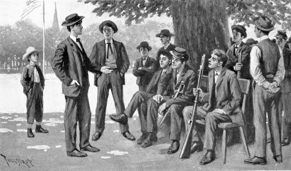 There were thirty-three of them, ranging in years all the way from eight to eighteen. They were eager and enthusiastic. And the light of the low sun, shining red on their faces, disclosed a spirit of earnestness among them, as well as that appreciation[5] of sport common to all American boys. At the command to fall in there was much pushing and jostling, much striving for desirable places, and even the young captain, with great show of authority, could not quite adjust all differences to the complete satisfaction of his men.
