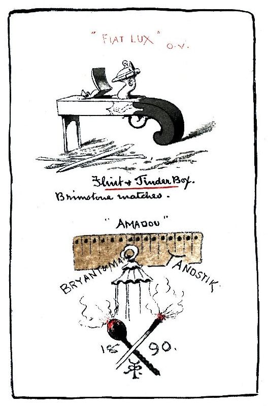 The Flint & Tinder Pistol combination was a very great advance when first introduced, striking a light in the dark with a Flint & steel is not easy & all who have tried will say so, then the old Brimstone flat matches were odorous, next we had French “Amadou” & a match like a walking stick topped with Brimstone explosive matter, then smaller ones followed by “TANDSTIKERS” & now hand in hand “VESUVIANS” of the delightful Wax “VESTAS.”