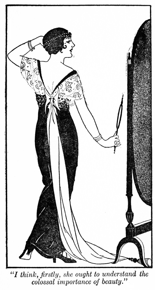 You must remember, Caroline, that you will be in a country where women are in an enormous majority—and the effect of this is that the men, unconsciously and naturally, have a great idea of their own value. It is not their fault, or because they are particularly vain men; it is simply because there are so few of them and so many of us! Therefore, if you want really to enjoy life and count as a coveted quantity, you must rise above the general company of young, unmeaning beings of your sex, so as to make the nice young man you may fancy think of you, not as one of a batch for him to choose from, but as the only desirable creature in all the world for him to strive to obtain. The really interesting thing is to be a personality, not one of the herd. And I would like to see you, Caroline, with your beauty and your position, starting a new fashion in young girls when you come out. For, my dear child, realize one thing,—all the stuff and nonsense which you may have been told about women fitting themselves for a self-sufficing existence, and their “rights” and their assertion of equality, are pitiful makeshifts, of use only if the poor things do not obtain the sole real joy and happiness—to be the loved and honored mate of some nice man. If, by your self-assertion and exaggerated mentality, you have been able to crush out all sex instinct, then you become as the working bee—of a third sex, an anomaly in nature, and a ridiculous excrescence in God’s scheme of human progression. So for heaven’s sake, my sweet Caroline, keep this in view. Train what individuality in yourself you will, but keep your clear perspective so as to be able to see the ultimate goal of happiness.