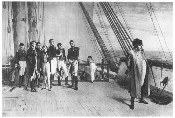 Napoleon left the field, and took the road to Paris, where he found his power gone. He resigned as emperor in favor of his son, and went to Rochefort in hope of finding a ship going to the United States. The English vessel Bellerophon blockaded the harbor, and Napoleon boarded it, throwing himself on the mercy of Great Britain. He reckoned, however, without his host; for England had never forgotten that Napoleon had threatened an invasion of Great Britain. Moreover, within the year Napoleon had been declared an international outlaw, “outside the pale of social and civil relations, and liable to public vengeance.”
