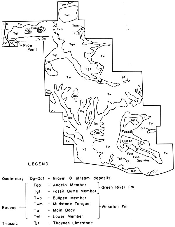 Within the monument itself the oldest rocks exposed are those of the Thaynes Limestone near Prow Point. As will be seen in the discussion of the structure of the Fossil Basin, all of the rocks beneath the Evanston Formation are folded and faulted and within the monument are buried by deposits of Tertiary age. For this reason detailed discussion of stratigraphic units will be confined to those rocks that can be seen within the boundaries of the monument or closely adjacent to it (Fig. 5). The distribution of the various formations within the monument is illustrated in Figs. 7 and 8.