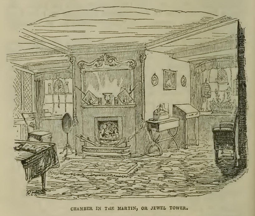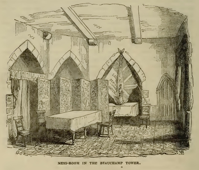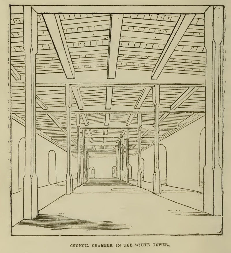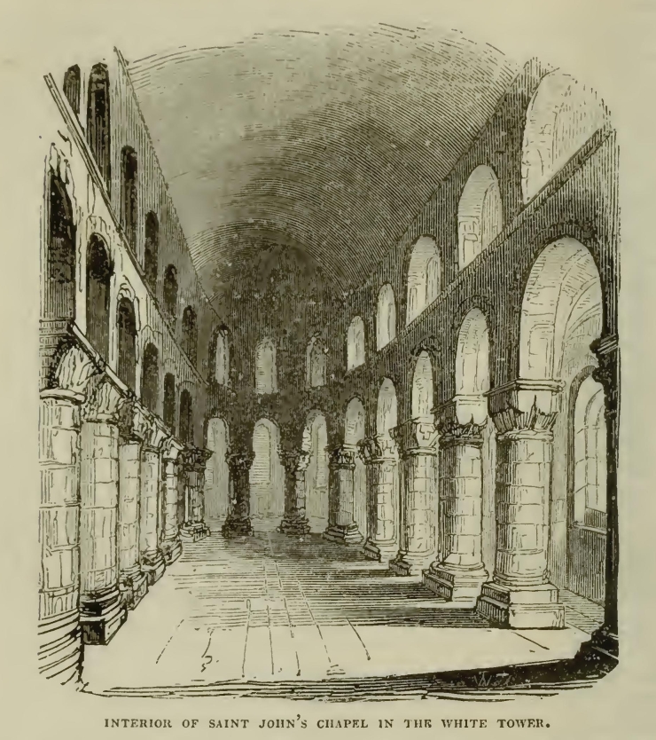 One important object the Author would fain hope his labours may achieve. This is the introduction of the public to some parts of the fortress at present closed to them. There seems no reason why admission should not be given, under certain restrictions, to that unequalled specimen of Norman architecture, Saint John’s Chapel in the White Tower,—to the arched galleries above it,—to the noble council-chamber, teeming with historical recollections,—to the vaulted passages—and to the winding staircases within the turrets—so perfect, and so interesting to the antiquary. Nor is there stronger reason why the prison-chamber in the Beauchamp Tower, now used as a mess-room, the walls of which, like a mystic scroll, are covered with inscriptions—each a tragic story in itself, and furnishing matter for abundant reflection—should not likewise be thrown open. Most of the old fortifications upon the inner ballium-wall being converted into private dwellings,—though in many cases the chambers are extremely curious, and rich in inscriptions,—are, of course, inaccessible. But this does not apply to the first-mentioned places. They are the property of the nation, and should be open to national inspection.