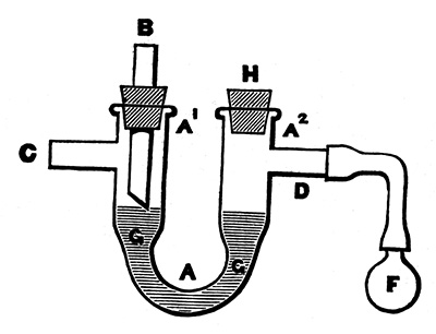 An Automatic Regulator of practical value is that devised by Ruegheimer. It consists of a glass tube, , , . is closed with an indiarubber stopper, through which passes a glass tube , the lower end of which is cut off at an angle. It is attached to the gas supply pipe. The tube is connected to the burners. To is attached, by means of rubber tubing, a glass bulb , which is placed inside the drying-box. is mercury, and a rubber stopper by which the pressure on the mercury and quantity of air in may be regulated.31 The action of the instrument is obvious. The gas passes down , over the surface of the mercury and by the tube to the burner. On the bulb reaching a certain temperature, the mercury will allow just sufficient gas to pass from the tube to maintain the box at a given heat. If it should fall, the mercury recedes from the aperture of the tube , a larger quantity of gas passes to the burner, and the temperature is restored to a normal degree. If the air in the ball expands to too great an extent, the mercury rises, and would eventually entirely close the aperture and cut off the gas supply, unless the tube is provided with a small hole acting as a by-pass. The tube may be moved up and down through the rubber stopper at as a means of adjustment.