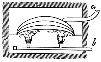 The Drying Box is of great importance to the successful working of the process. The opinions of the various practitioners with regard to the temperature at which the drying of the plates should be effected differ as widely as upon the advisability or29 otherwise of admitting a current of air through the box during the operation. The drying should be completed as rapidly as possible from the commencement of the operation, care being taken that the heat never exceeds 50°C. Many plate-makers simply dry the plates in an open apartment—of course, only illuminated by a non-actinic light—simply placing the plates on a horizontal surface, which may be maintained at the temperature indicated by a water bath, a lithographic stone, or merely a cast-iron plate arranged in a suitable manner for heating from below. This method of drying is open to many objections: the surface of the plate is seldom free from dust, and the gelatine coating is too liable to irregularities from draughts admitted to the apartment during the process. They are more frequently dried in specially-constructed boxes provided with screws for accurately levelling the plates, and through which only a small circulation of air takes place. These boxes are usually rectangular in shape, the upright sides being of wood and the bottom of sheet iron. The lid is an open framework covered with a close orange or black cotton material, the whole standing upon four iron legs over a spirit or gas flame. In the upper part of the box a thermometer is fixed, about the centre of either the side or lid, in such a position that it may be readily observed without the necessity of opening the box. Strong horizontal iron bars are placed across at about the centre, and are provided with30 thumbscrews, upon which may be placed a plate of glass bearing a circular spirit level, by which means the plates may be levelled with the greatest accuracy. The sheet-iron bottom of the box being heated unevenly, it becomes necessary to mitigate this inconvenience as far as possible, which is easily done by covering the plate to a depth of about half-an-inch with dry river sand, over which should be placed tissue paper to keep down any possible dust.