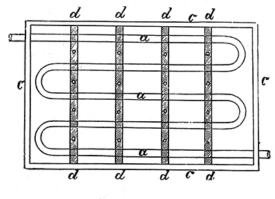 M. Thiel, of Paris, uses a very convenient drying-box, which, with his permission, is here explained. In a brick-lined receptacle under the laboratory floor lies the water-heating apparatus, which is constructed of sheet copper, and is capable of containing about four litres of water, utilised in the production of steam for heating the box. a, fig. 3, is the pipe passing through the wall into the32 drying-box; b is the gas supply pipe to the two atmospheric burners. Fig. 4 represents a plan of the drying-box; c c c c the perpendicular sides of the same, a a a gives a plan and position and arrangement of the earthenware heating pipes lying in a serpentine form at the bottom of the box, entirely covered with dry sand, and this again covered, as before described, with tissue paper. b is the outlet of the steam pipe. d d d d are movable horizontal iron bars with adjusting screws, on which the plates are levelled. The box is covered by a hinged lid, which is raised about a couple of inches during the drying to allow the air to circulate. The dimensions of the box will be determined by the size of the plates to be used, several of which may be placed side by side. Its height is about half a metre inside, and the plates are placed about its centre.